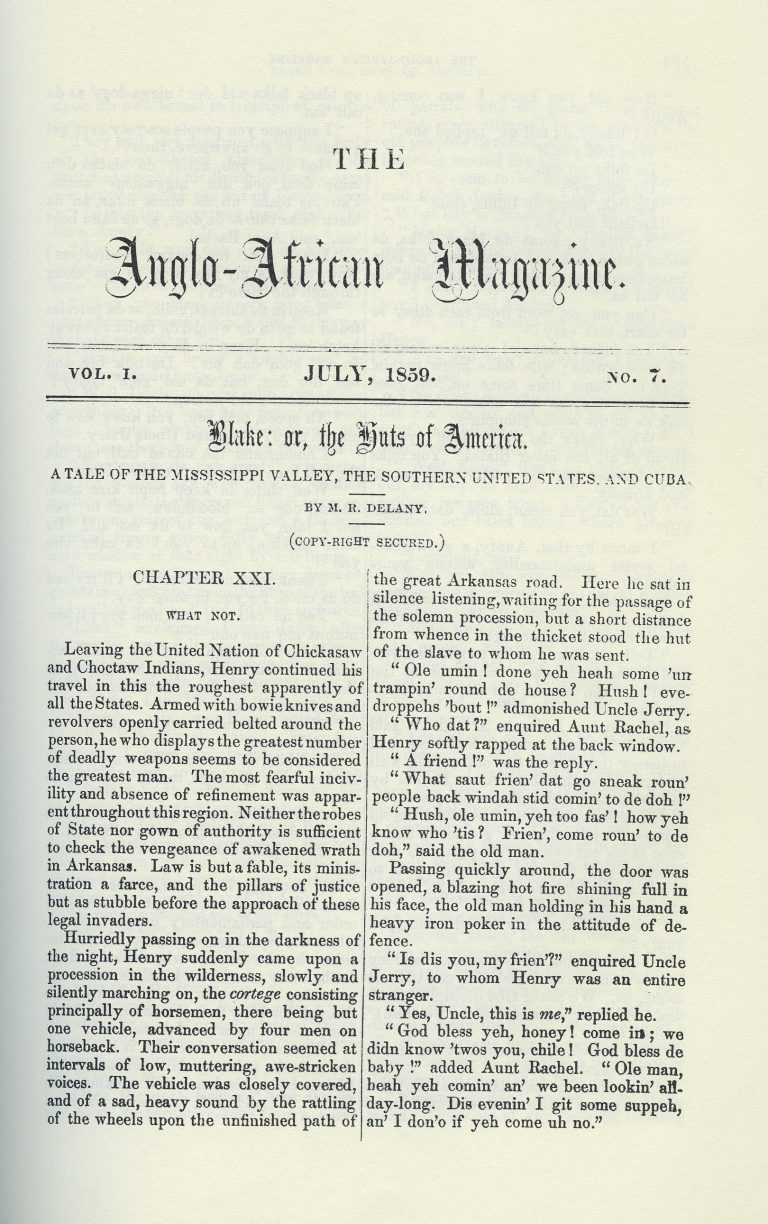 Blake: or, the Huts of America was published in The Anglo-African Magazine, one of the earliest periodicals featuring Black editors and directed towards a Black audience