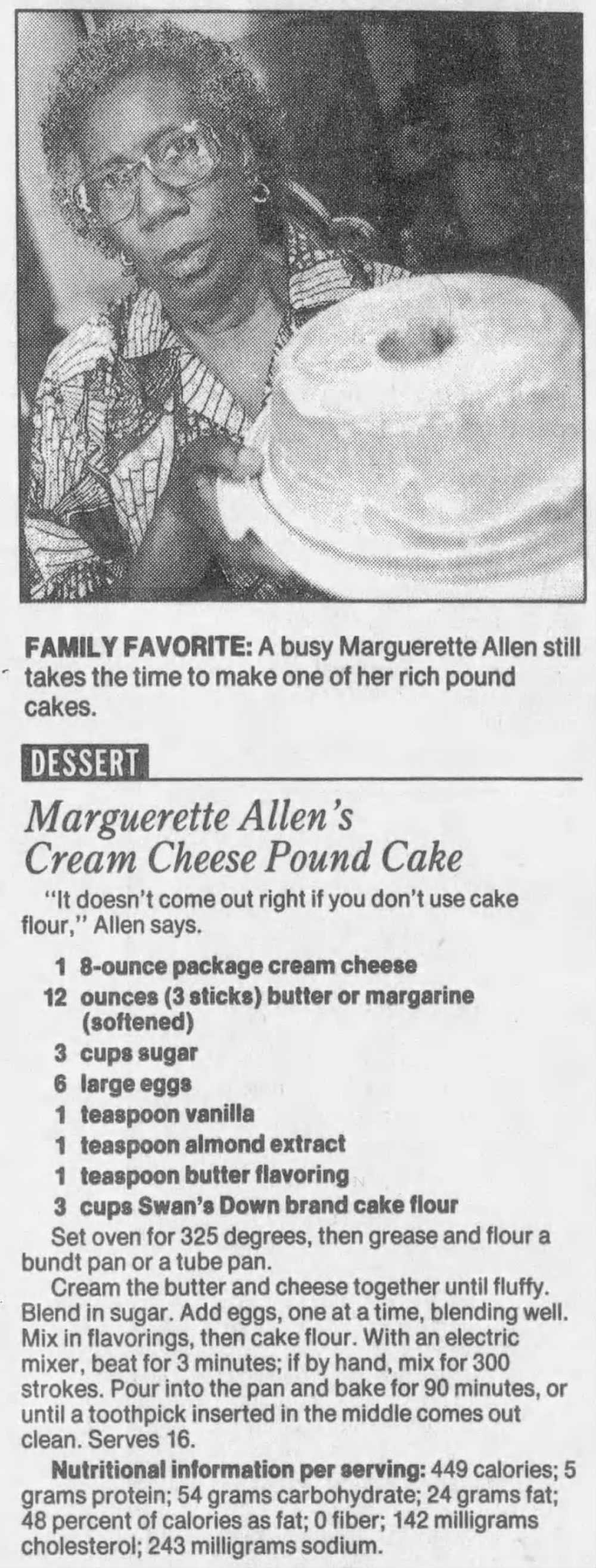Pound cakes are served at family gatherings, repasts, bake sales, and church picnics. Marguerette Allen made her Cream Cheese Pound Cake for family holiday celebrations and special occasions. The Miami Herald featured Allen and her recipe as part of a special feature on soul food traditions. A native of Tifton, Georgia, Allen learned to cook from her mother. Her recipe calls for a teaspoon of vanilla and eight ounces of cream cheese.