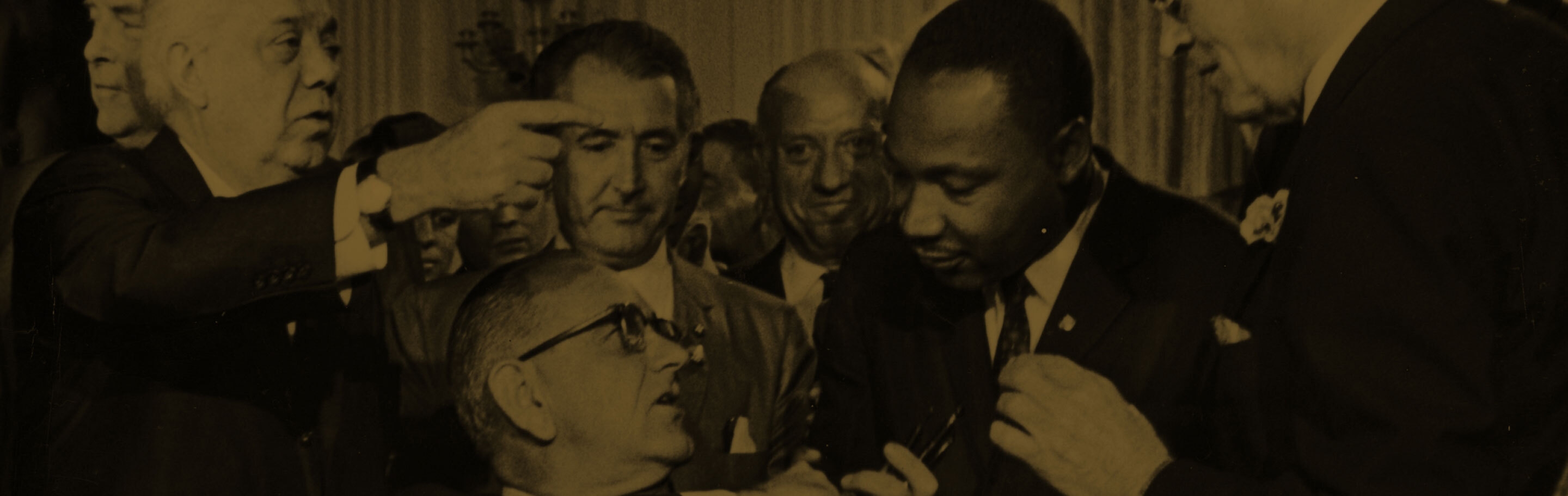 President Lyndon B. Johnson shakes hands with Martin Luther King Jr. after signing the Civil Rights Act.