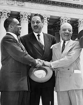Left to right: George E. C. Hayes, Thurgood Marshall, and James M. Nabrit, congratulating each other following Supreme Court decision declaring segregation unconstitutional.