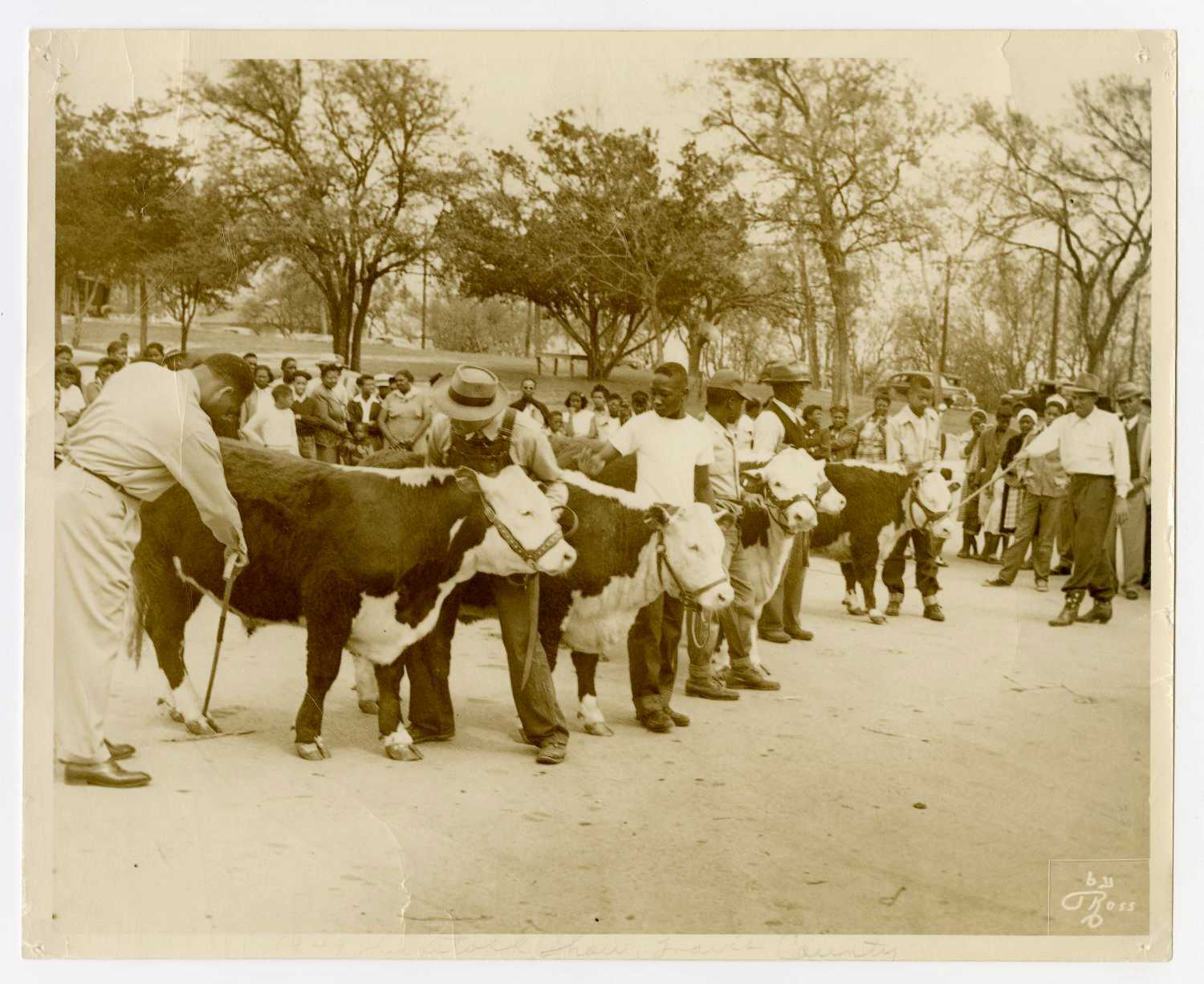 The “Portal to Texas History” features photographs documenting the program’s activities. Many are images of the annual Food and Livestock Show at Rosewood Park in Austin. In this photo, young men display calves they raised.